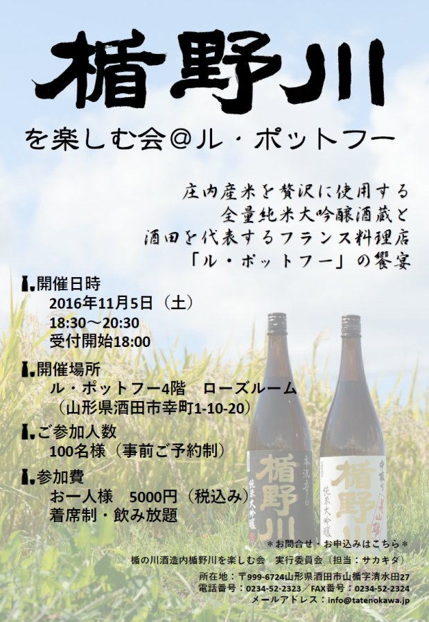 さて、今年も弊社では下記の通り「楯野川を楽しむ会」を開催させていただく運びとなりました。今回もたくさんの日本酒と、ル・ポットフーのお料理をゆっくりとお楽しみいただけます。